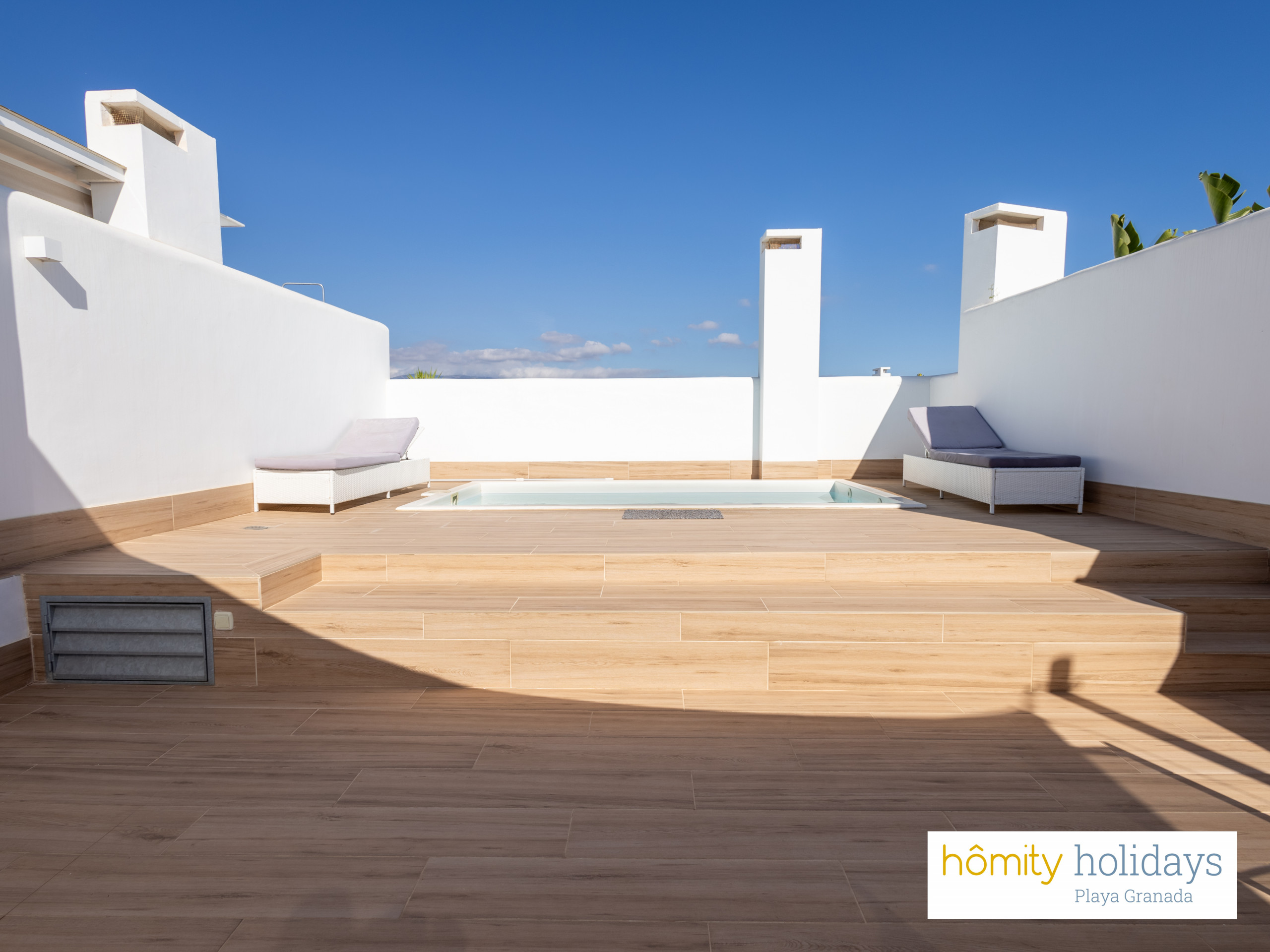 Este ático de lujo con piscina privada cuenta con 2 dormitorios, capacidad para 6 personas, una superficie de 80 m² y una terraza de 89 m². Se encuentra a 800 m de la playa y a 1 km del campo de golf.