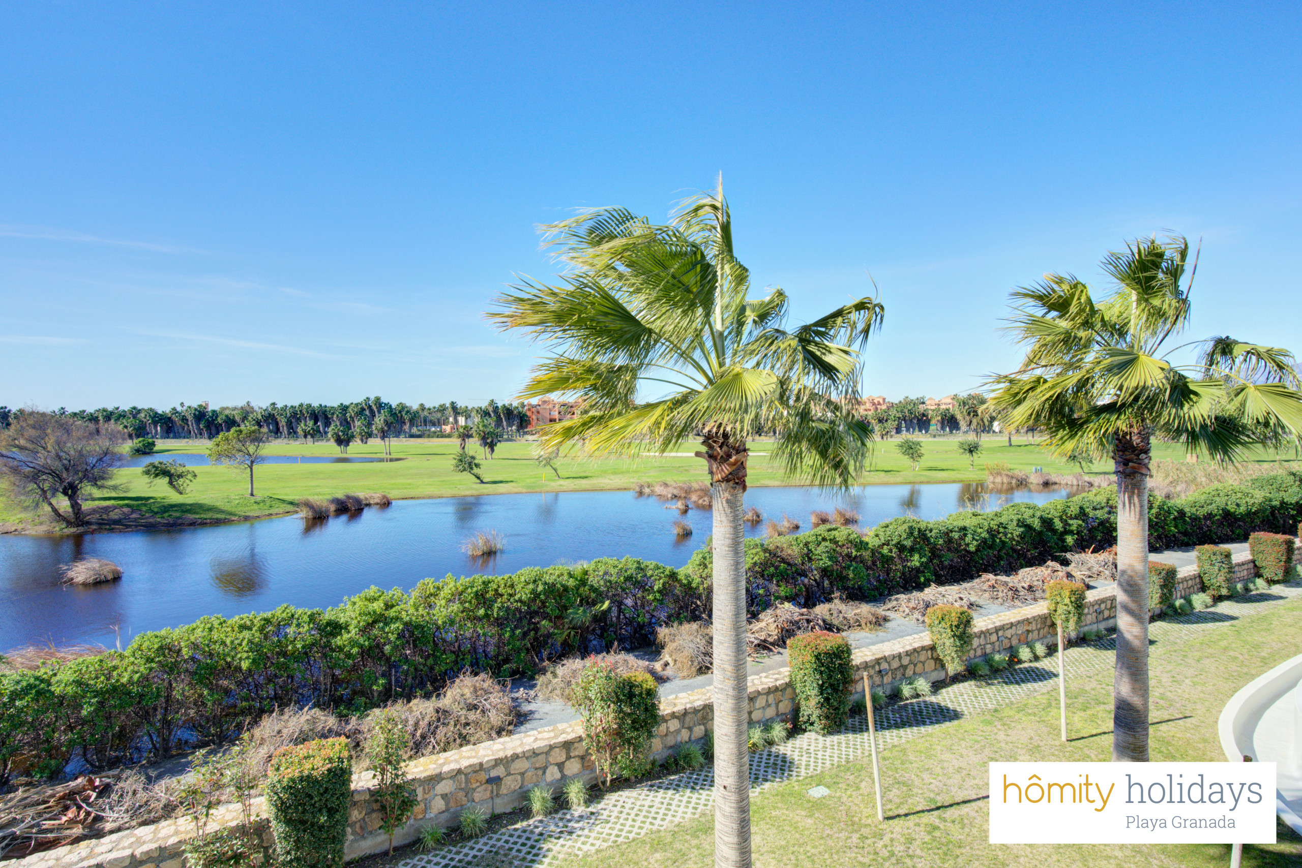 Indkvartering på 76 m² smukt og fuldt udstyret, beliggende i første række ved golfbanen, med udsigt over golfbanen og swimmingpoolen.