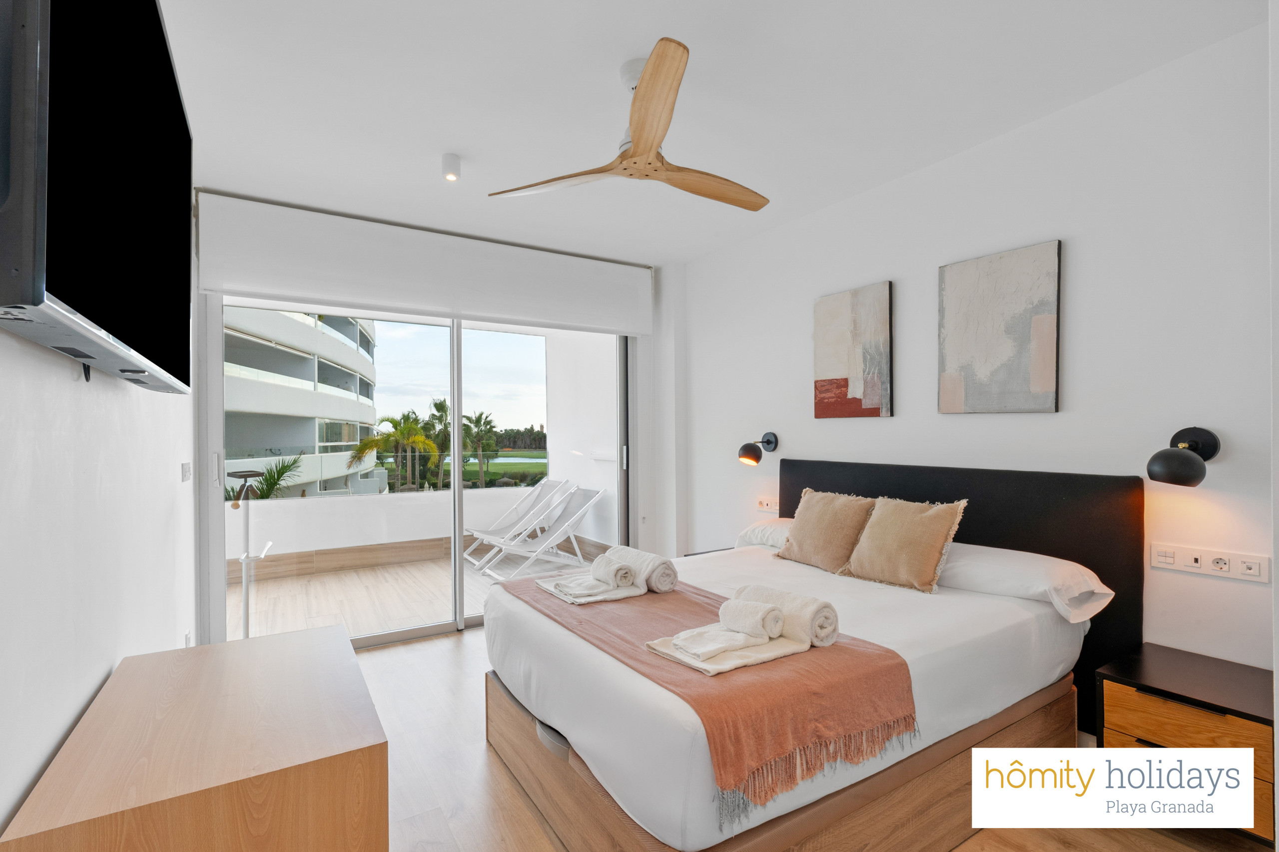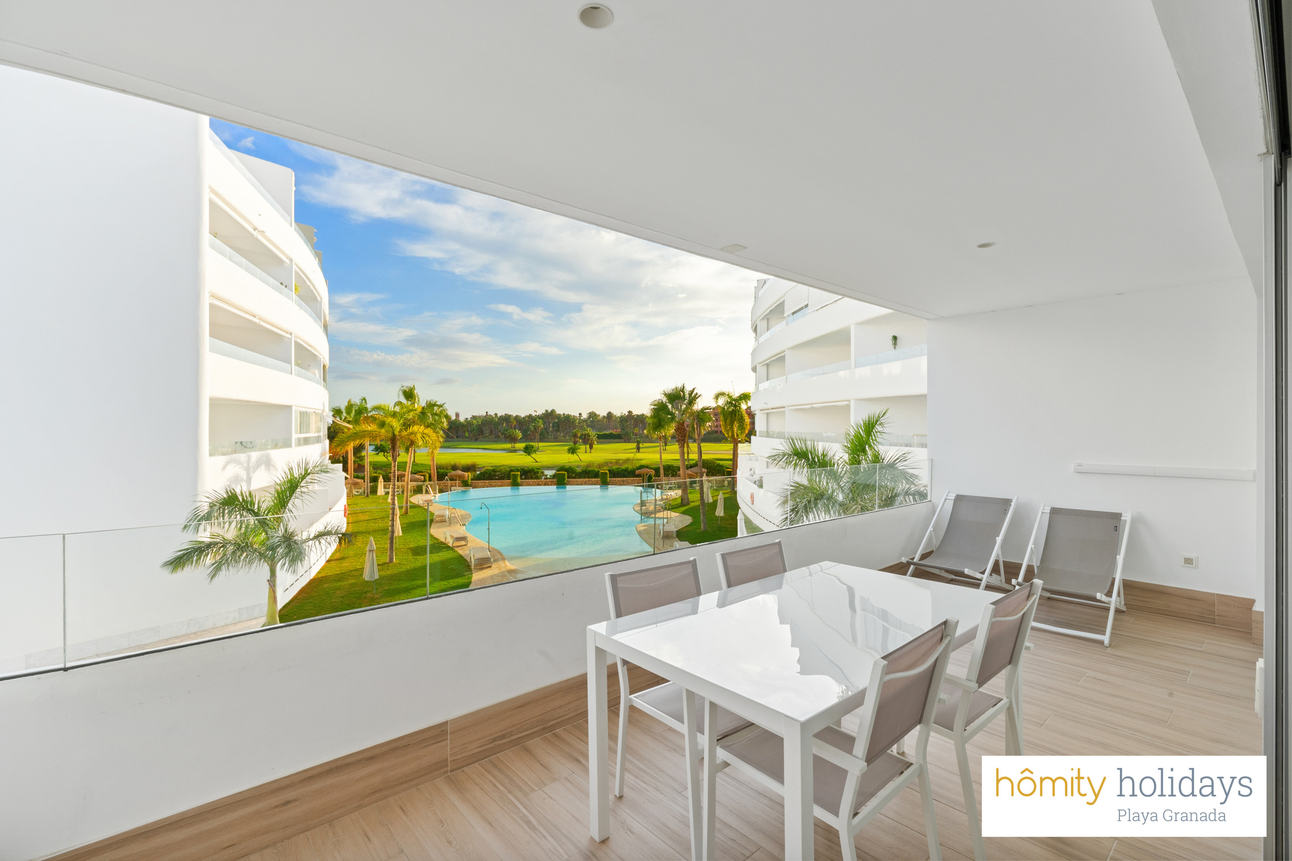 Denne luksuriøse lejlighed har 2 soveværelser, plads til 6 personer, et areal på 78 m² og en terrasse på 15 m². Den ligger 800 m fra stranden og 1 km fra golfbanen.