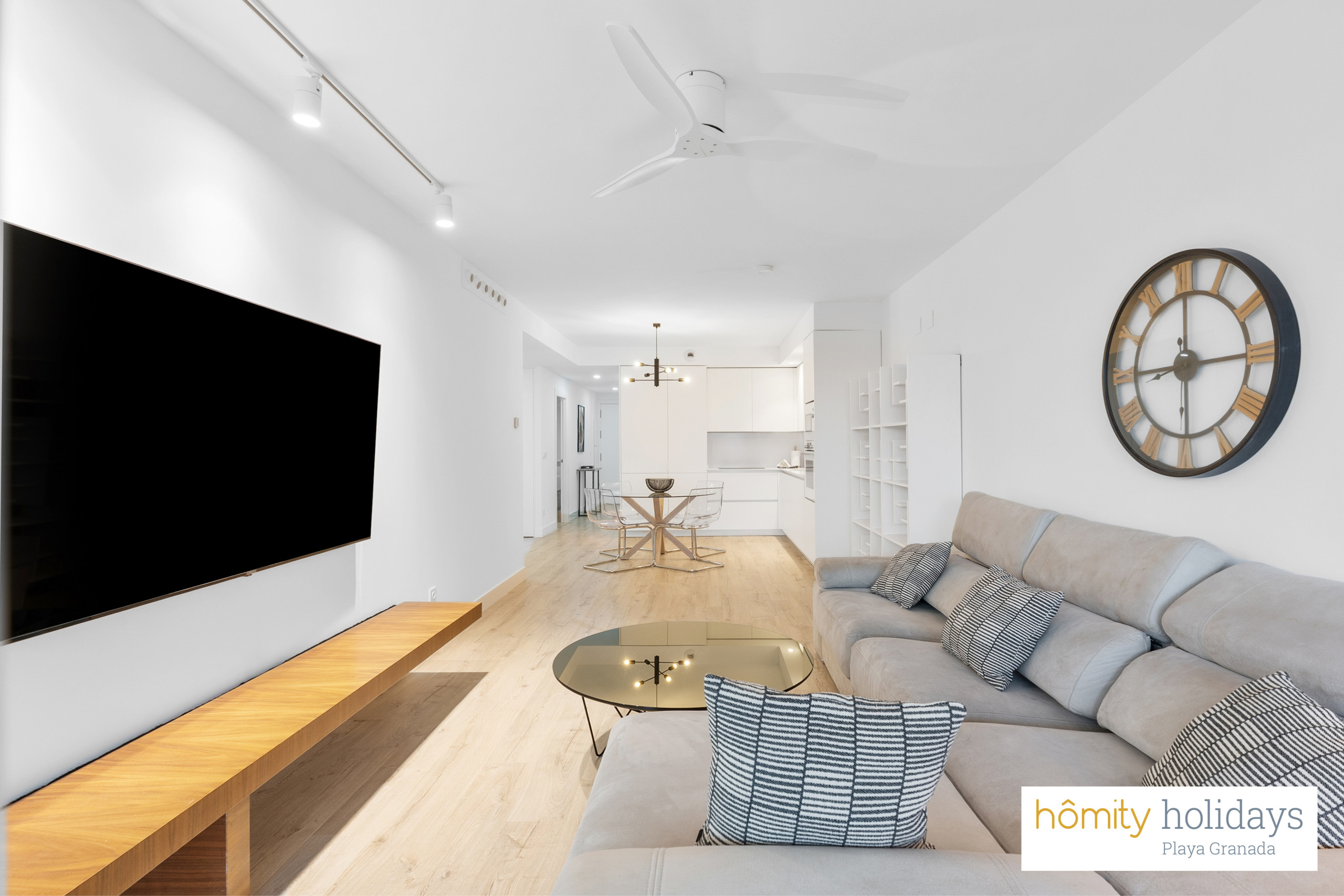 Tilbyder elevator, terrasse 22 m², vaskemaskine, strygejern, internet (wifi), hårtørrer, børneområde, padelbane, varmepumpe, aircondition i hele ferielejligheden, swimming pool fælles, garage til den samme bygning, 4 electric anti-mosquito devices, 4 fans, 4 Fjernsyn.